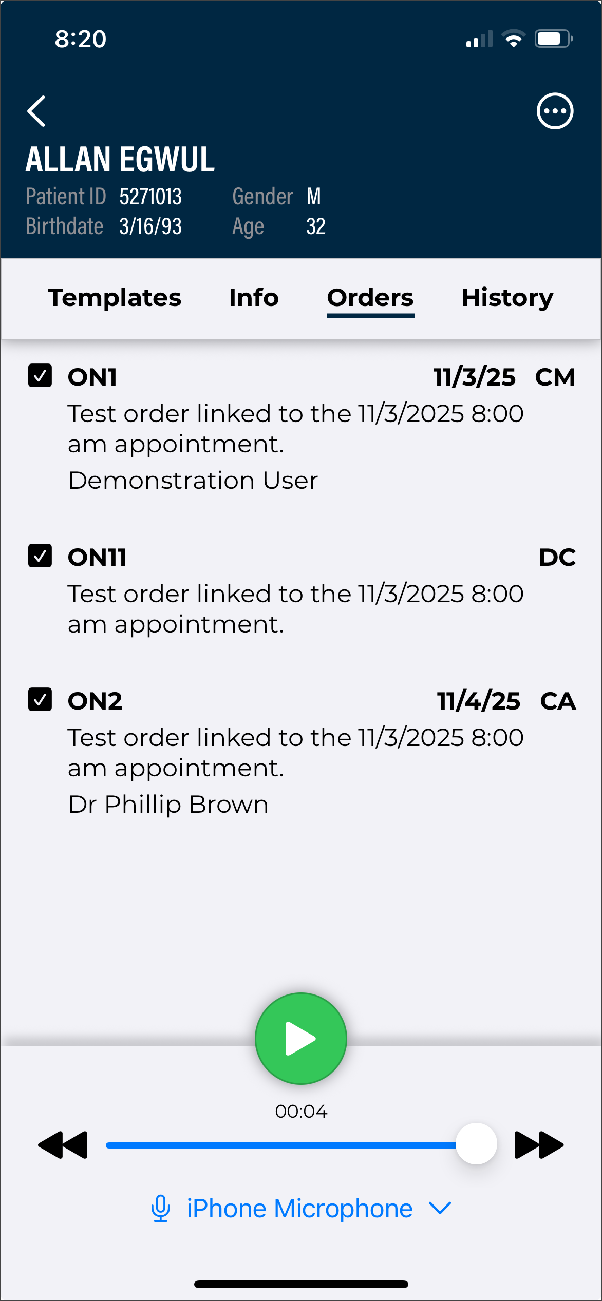 - Verify the correct Document Type and Dictator are selected in the demographics.
